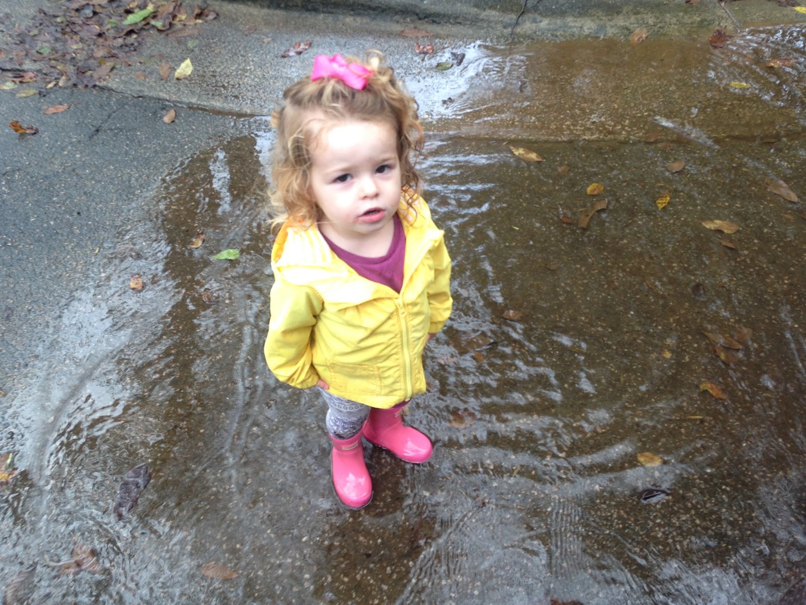Once the clouds started to lift, we got outside for a walk around the neighborhood. I promised the girls we could go splash in puddles...