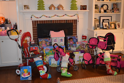 The girls could not rip through their stuff fast enough so Santa did not last very long. Then they were happy to play with their toys while we worked on breakfast. Unfortunately, we will always remember our Christmas breakfast because those darn cinnamon buns caught on fire. 😬 Yep, the gooey glaze dripped onto the bottom of the oven and all of a sudden we saw flames. The girls completely freaked out, and to be honest, Brian and I did a little bit too. We quickly doused the flames, but the kitchen smelled pretty bad after that. And would you believe- the sticky buns were actually still delicious? That Ina knows her stuff. :)Anyway, after that drama, we commenced the present opening. Time to open the presents from each other under the tree! The girls were really excited about this part because this year for the first time, they picked out a present for each other. I took them to the toy store, and gave them each $10 to spend on the other. Sara gave me this idea, and I thought it was wonderful. They are on the receiving end of so much at Christmas, but they need to experience what a lovely feeling it is to GIVE.